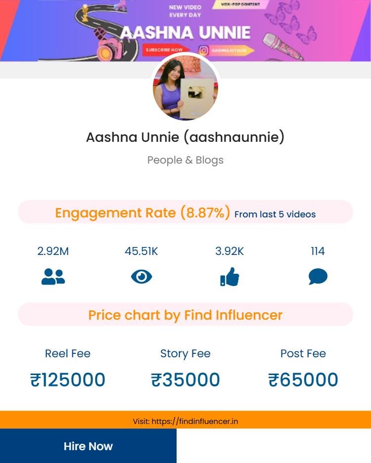 Plan your next influencer collaboration with confidence using the Find Influencer Price Calculator. This tool helps estimate campaign costs based on Aashnaunnie’s current social media metrics.
