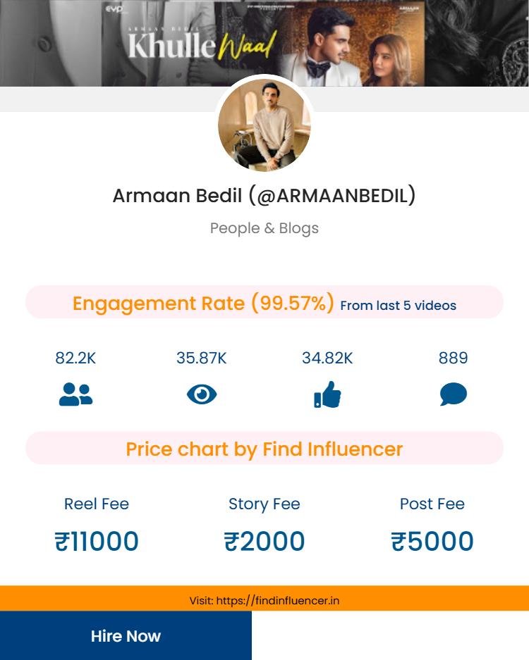 Armaan Bedil is also active on YouTube, where he shares music content and extended videos—providing brands with a long-form platform for storytelling. YouTube subscription and pricing details will be added soon.