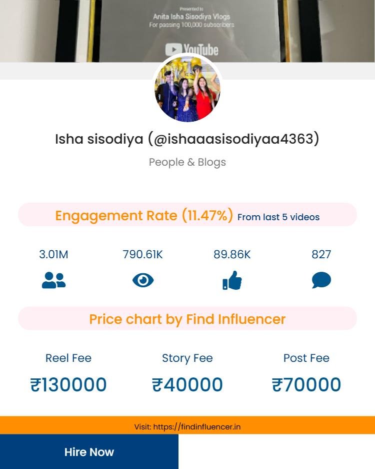 Disclaimer*: “The content and promotion prices shown on this website are based on our own analysis and suggestion, generated through Find Influencer’s (FI) in-built calculator using public metrics (followers, engagement, category). These are indicative values for informational purposes only and are not official rates. Actual fees may vary in real collaborations. Find Influencer has no direct affiliation or endorsement with the influencers mentioned unless stated otherwise. Please confirm directly with the influencer or their agency before making any business decision. If you are the influencer featured here and wish to update or change your displayed price, you can contact us at info@findinfluencer.in or call at 8218235970. We will promptly verify and make the necessary corrections.”