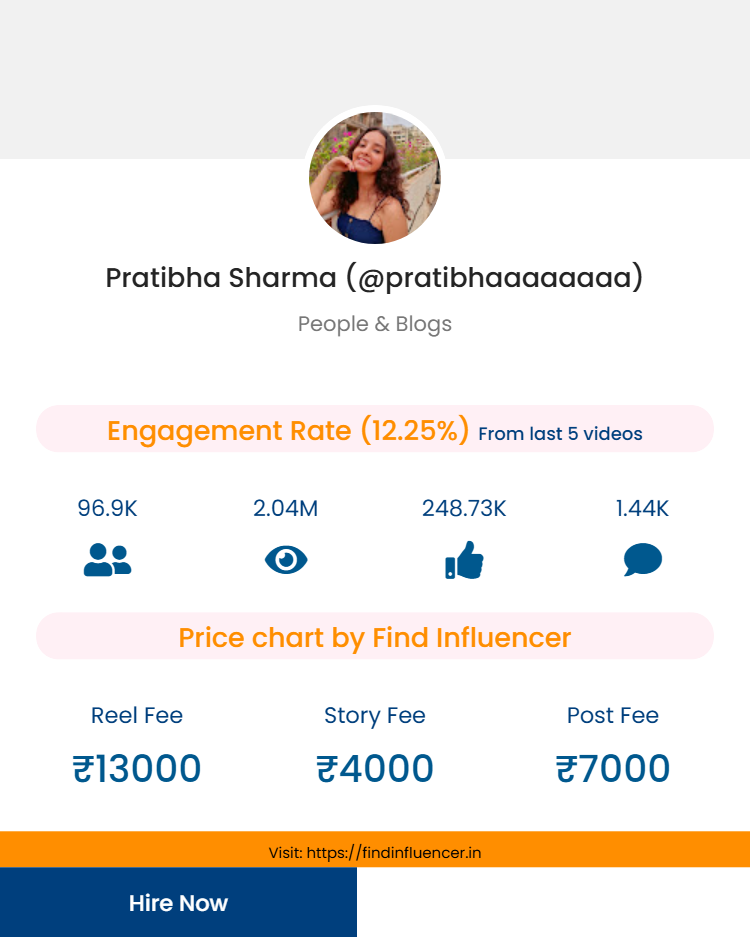 Disclaimer*: “The content and promotion prices shown on this website are based on our own analysis and suggestion, generated through Find Influencer’s (FI) in-built calculator using public metrics (followers, engagement, category). These are indicative values for informational purposes only and are not official rates. Actual fees may vary in real collaborations. Find Influencer has no direct affiliation or endorsement with the influencers mentioned unless stated otherwise. Please confirm directly with the influencer or their agency before making any business decision. If you are the influencer featured here and wish to update or change your displayed price, you can contact us at info@findinfluencer.in or call at 8218235970. We will promptly verify and make the necessary corrections.”