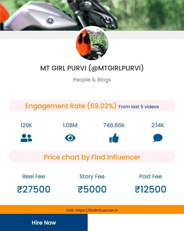 Disclaimer*: “The content and promotion prices shown on this website are based on our own analysis and suggestion, generated through Find Influencer’s (FI) in-built calculator using public metrics (followers, engagement, category). These are indicative values for informational purposes only and are not official rates. Actual fees may vary in real collaborations. Find Influencer has no direct affiliation or endorsement with the influencers mentioned unless stated otherwise. Please confirm directly with the influencer or their agency before making any business decision. If you are the influencer featured here and wish to update or change your displayed price, you can contact us at info@findinfluencer.in or call at 8218235970. We will promptly verify and make the necessary corrections.”
