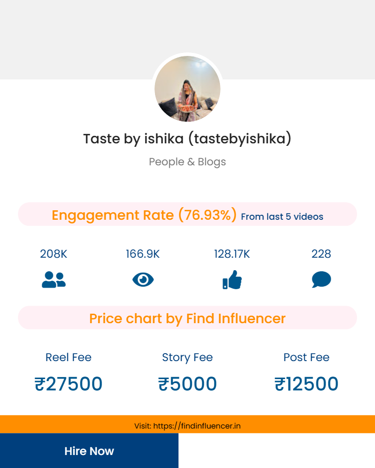 With over 208K followers and an engagement rate of 76.93%, Taste by Ishika provides brands both visibility and meaningful audience interaction.
