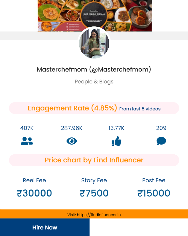 With 1.1 million followers on Instagram and an impressive 3.92% engagement rate, Uma Raghuraman—popularly known as MasterChef Mom—has built an inspiring digital presence rooted in her love for cooking and storytelling. Her journey from home chef to celebrated food artist showcases her authenticity, consistency, and creative excellence.