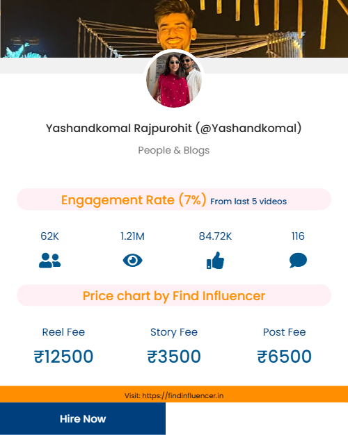 With 62K followers on Instagram and a 7% engagement rate, Yash Rajpurohit has developed a niche audience that actively interacts with his content. His videos often reflect everyday moments and simple storytelling, helping him maintain a genuine bond with his followers.