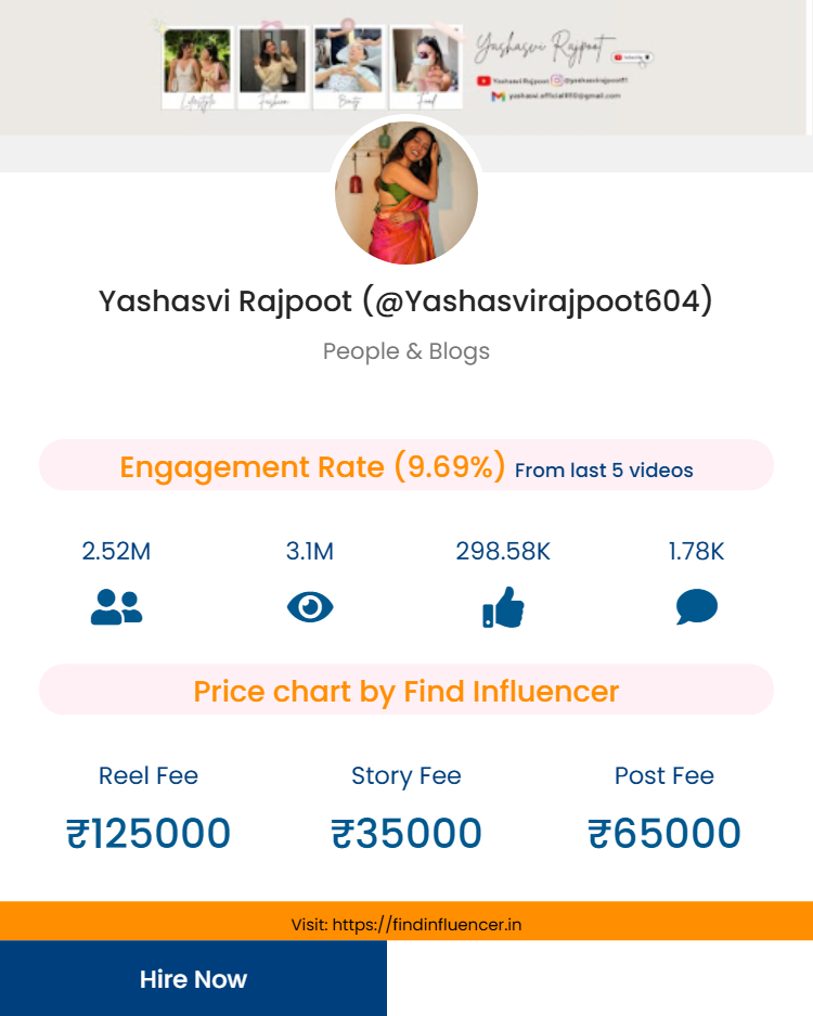 Plan your influencer campaign effectively using the Find Influencer Price Calculator. This tool helps brands estimate collaboration costs based on Yashasvi Rajpoot’s current social media metrics.